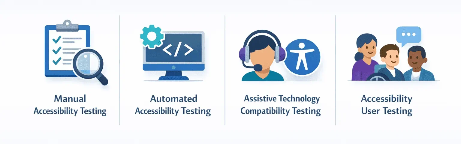 Understanding the different accessibility testing types helps in implementing a clear testing strategy. These types are supported by accessibility testing software that mixes automated scans with manual validation workflows.
