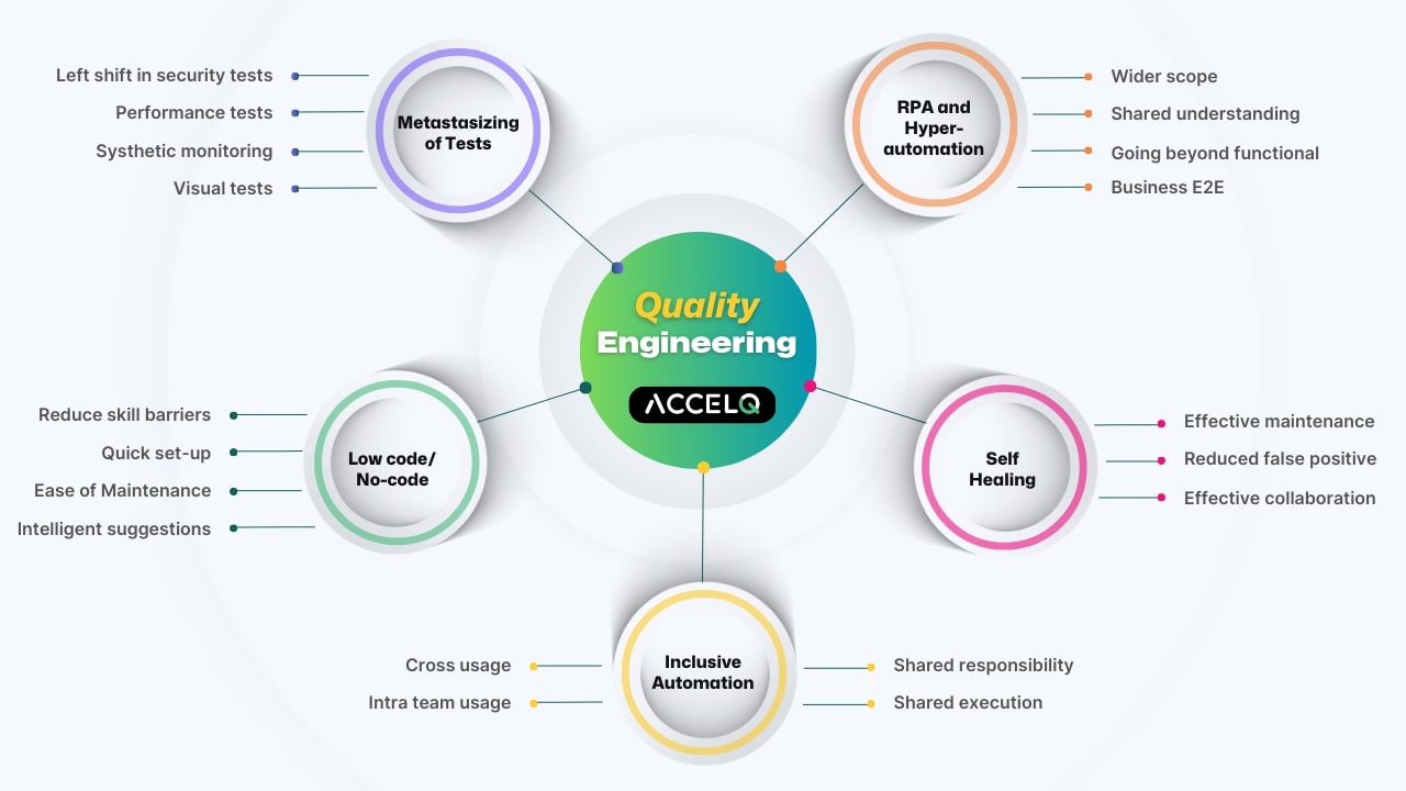 Embracing AI and machine learning tools is the foreseeable and one of the top software quality engineering trends. Test engineers must acquaint themselves with innovative, intelligent test design methods. ACCELQ exemplifies this innovation with its No-Code platform that detects frontend changes and applies machine learning to continuously self-heal, ensuring robust and resilient test automation.