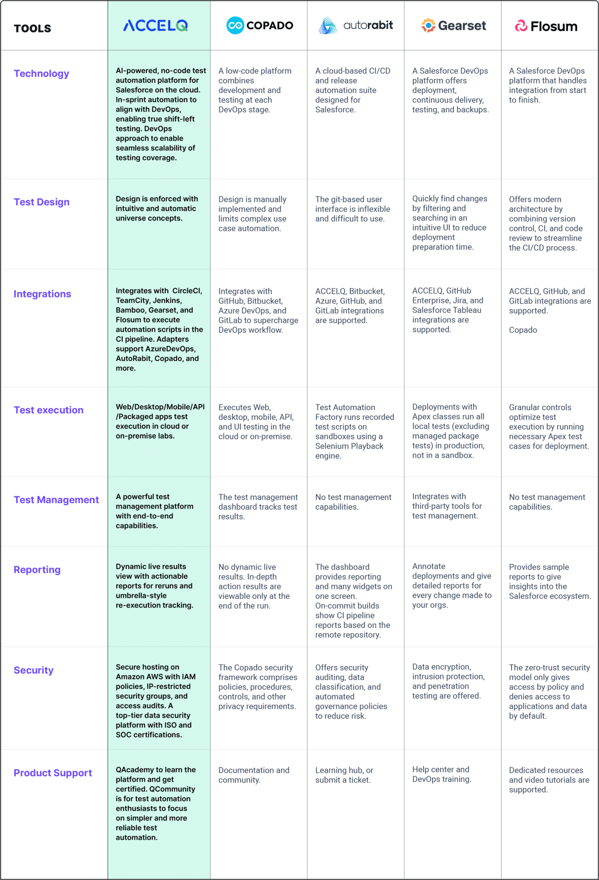 | Integrations | Consider tools that connect seamlessly with an existing Salesforce instance, CI/CD pipeline, and version control platforms like Git. |