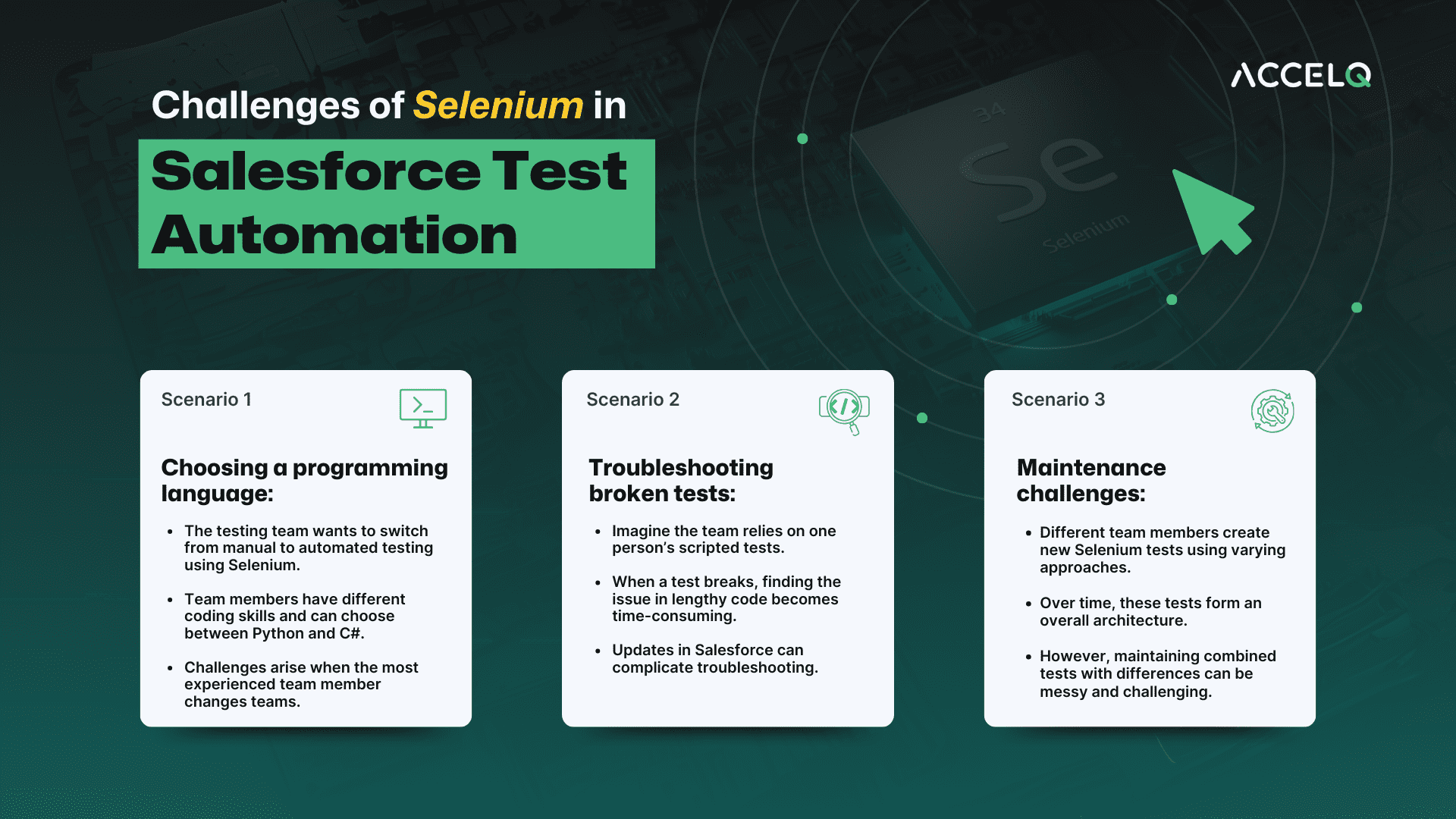 Imagine a scenario where the rest of the team is testing with one individual’s scripted tests. It might keep working well till one day, a test breaks. Troubleshooting this code involves checking lines of lengthy codes, and finding one minor issue gets cumbersome and time-consuming. Updates in the Salesforce application may make this more complicated.