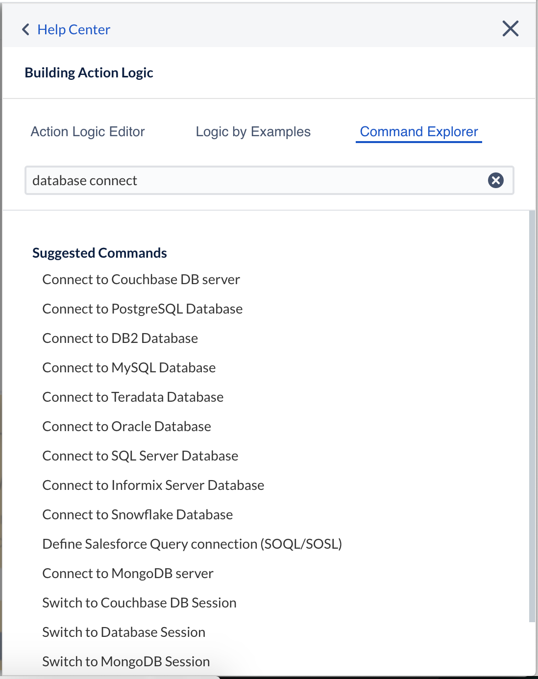 The Command Explorer help module is significantly enhanced for better usability and command search. While you are building statements in Action logic, you can contextually open the command explorer and find further help and options.